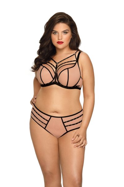 Urzekająca kunsztownym wykonaniem oraz seksownym designem Rachel N°02 jest niezwykle kusząca. Błysk złota na tle głębokiej czerni przyciąga wzrok i pozwala rozkoszować się tym wysmakowanym duetem barw. Wyzierająca spod transparentnego tiulu beżowa pianka otula i podtrzymuje biust od spodu, a ekskluzywny haft zdobi jego górne partie. Przezroczysty obwód i mostek precyzyjnie przylegają do ciała, dodatkowo stabilizując biustonosz. Kulistość piersi podkreślą czarne elastyczne paseczki rozpięte między metalowymi kółkami w kolorze rose gold.